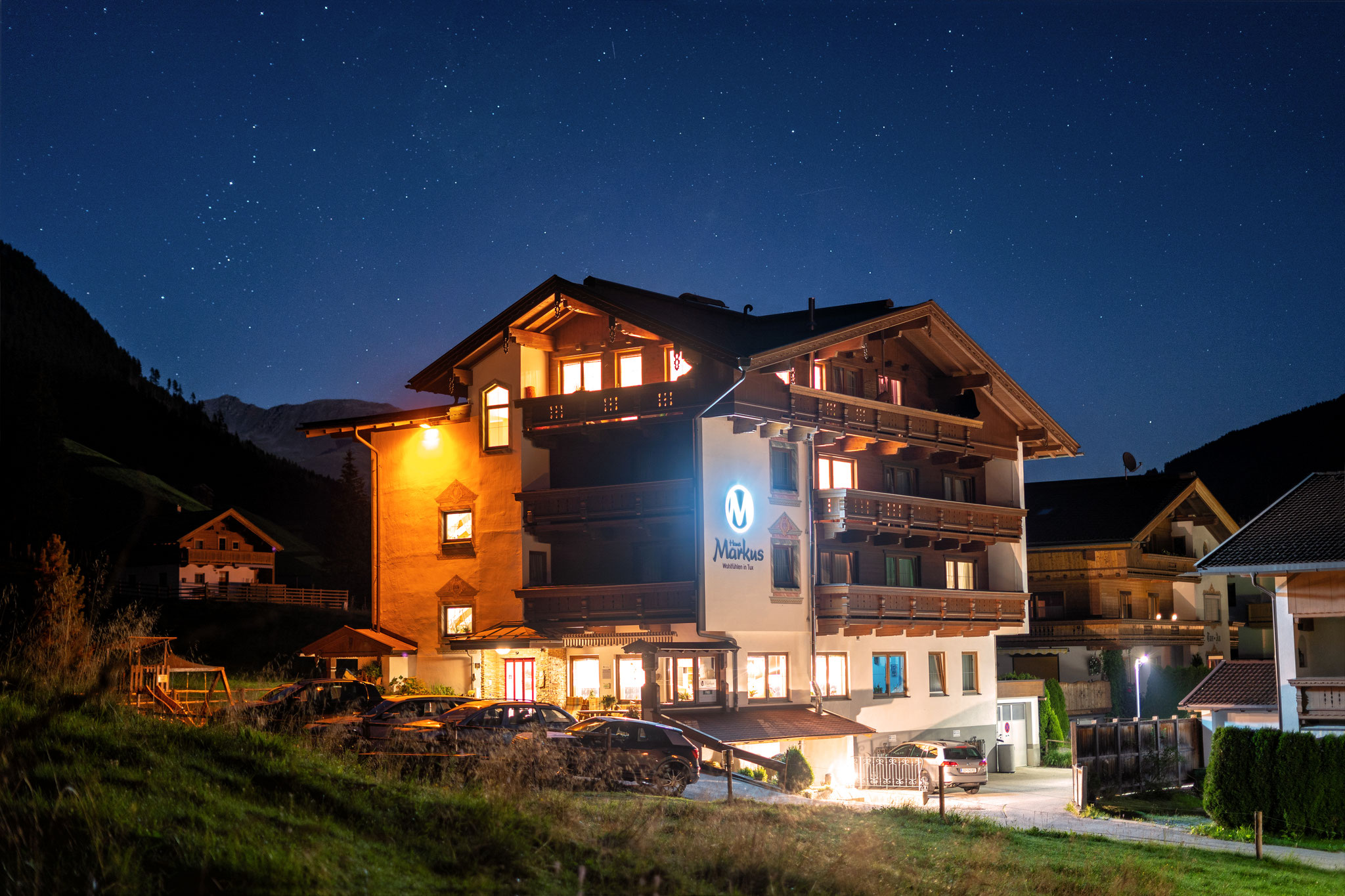 Das Haus Markus liegt am Waldrand von Madseit, mit herrlichem Blick auf den Hintertuxer Gletscher, von dem wir nur 3 km entfernt sind. Perfekt gelegen um direkt von uns aus tolle Wanderungen zu unternehmen oder auf der Luggi-Gredler-Loipe im Winter eine Runde Langlaufen zu gehen. In 3-5 Gehminuten entfernt befindet sich eine Bushaltetestelle, von wo Ihr mit dem kostenlosen „Tuxer Sportbus“ direkt zum Wandern oder Skifahren gebracht werden. Für einen erholsamen Urlaub in Tux empfängt euch unser Haus mit hellen, komfortablen Zimmern mit Balkon. Neben einer gemütlichen Einrichtung sind alle Zimmer mit Dusche/WC, Fön, Telefon, Balkon, W-LAN und Sat-TV ausgestattet. Wir verwöhnen unsere Gäste mit einem reichhaltigen Frühstücksbuffet mit einem Maximum an einheimischen Produkten. Im ganzen Haus bieten wir euch das speziell energetiesierte Grander Wasser an, welches ein eigens belebtes Wasser ist. Unser Frühstücksraum mit Getränkekühlschrank lädt nach einem Ski- oder Wandertag zum geselligen Zusammensitzen ein. Nach euren sportlichen Aktivitäten könnr Ihr euch in unserem kleinen aber feinen Saunabereich mit finnischer Sauna, türkischen Dampfbad, Infrarotkabine, Ruheraum und Frischluftraum perfekt regenerieren. Für alle, die noch Lust auf Bewegung haben, steht unser Tischtennisraum rund um die Uhr zur Verfügung. Unser Skiraum ist mit einem Skischuhtrockner ausgestattet, damit eure Ski- und Snowboardschuhe am nächsten Morgen wieder trocken und warm sind. Für den kulinarischen Genuss am Abend sorgen zwei Restaurants, die nur wenige Gehminuten vom Haus Markus entfernt sind.
