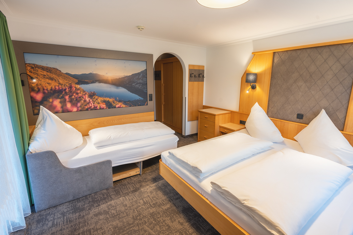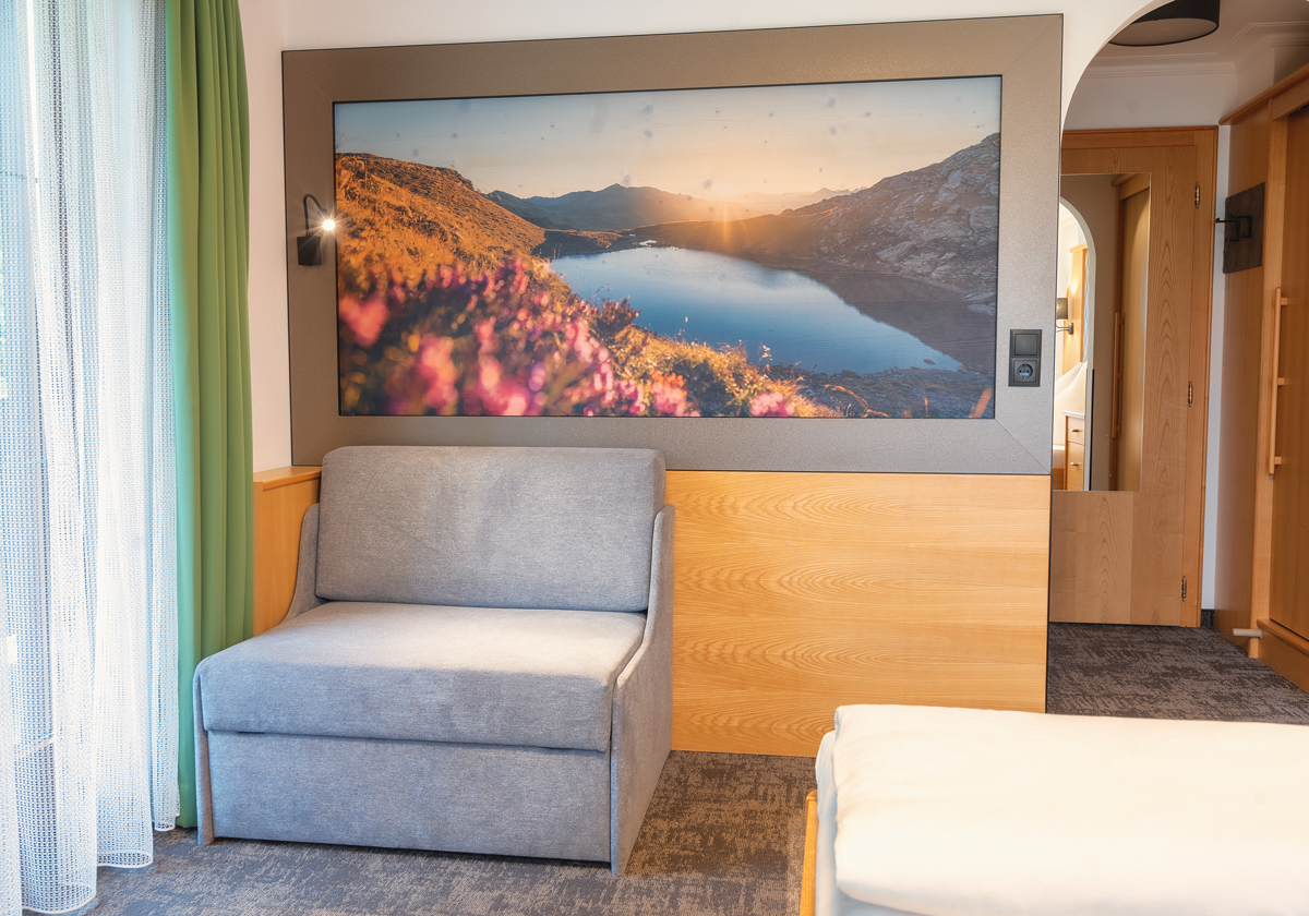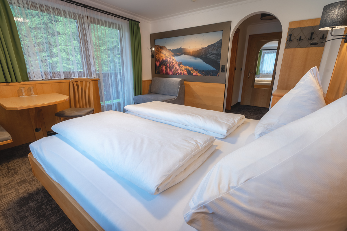 Genießt euren Urlaub in einem unserer gemütlichen Doppelzimmer mit Sitzecke und traumhaftem Gletscherblick. Diese Zimmer sind ausgestattet mit